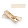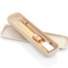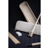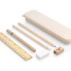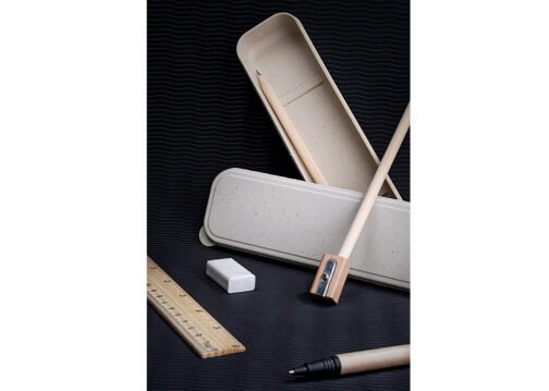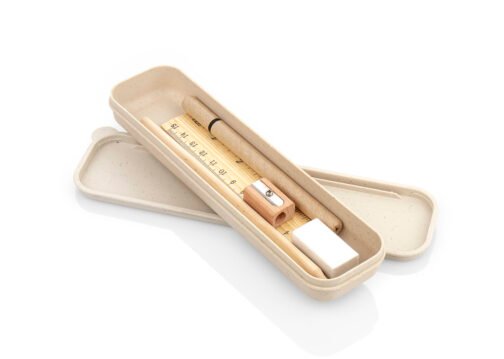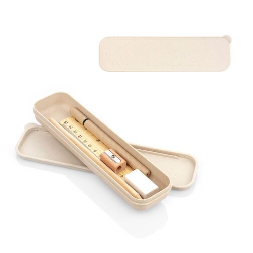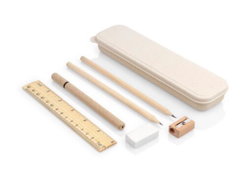 Set de escritorio en estuche en Paja de trigo”. Incluye bolígrafo con tapa y tinta negra, borrador, 2 lápices, tajalápiz y regla de 15 cm / 6 pulgadas.