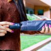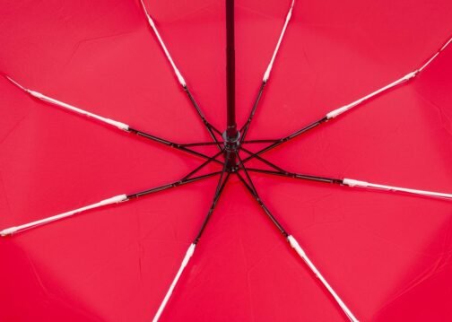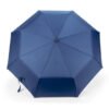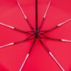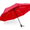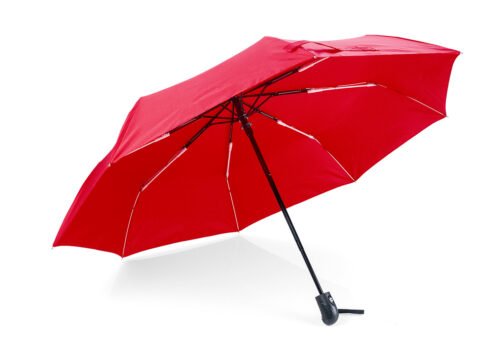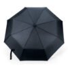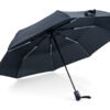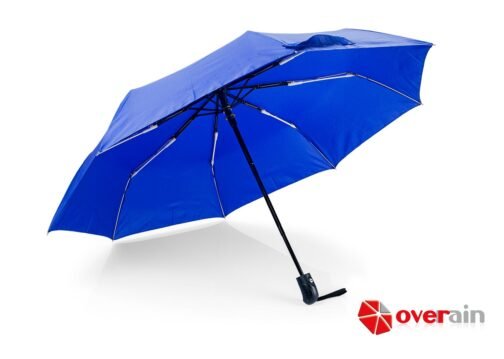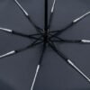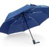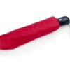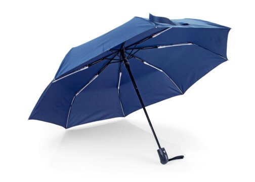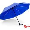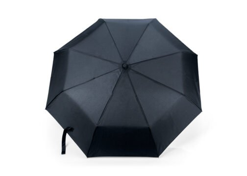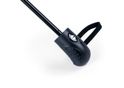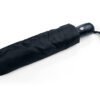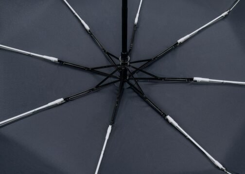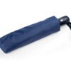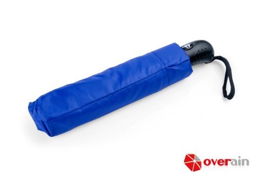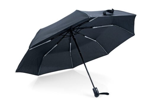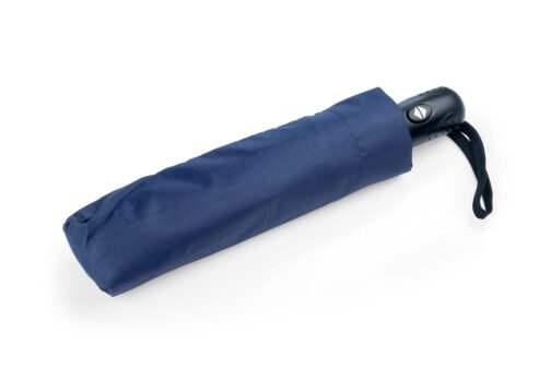 Paraguas con apertura y cierre automatico en 3 secciones, 8 cascos, costillas en fibra de vidrio color negro a prueba de viento, vara metálica, tela en Pongee con cinta para cierre con velcro, mango en PP con correa y funda protectora.